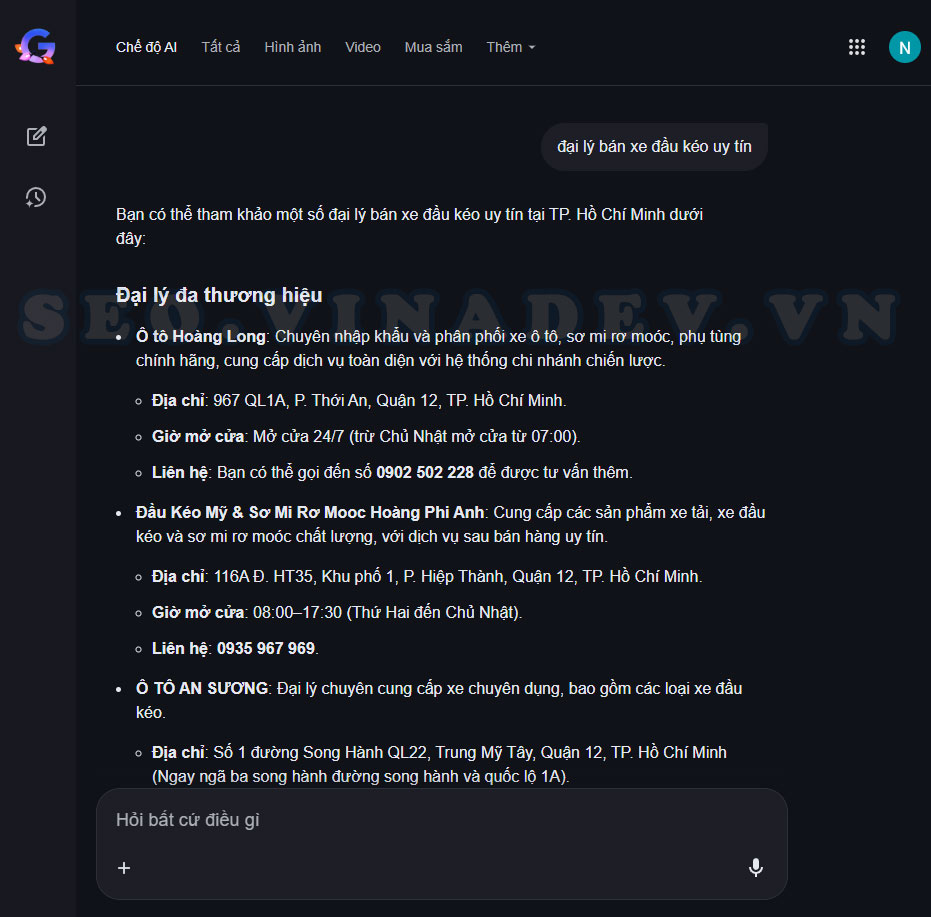 VINADEV Hi-TECH đã triển khai rất nhiều dự án SEO cho xe & phụ tùng nên kinh nghiệm cho thấy uy tín quan trọng hơn là giá rẻ. Hầu hết, khách hàng ngành này sẽ kiểm tra mức độ uy tín từ người thân, nhóm hội bạn bè, các diễn đàn giai đoạn trước khi có AI và bây giờ là các công cụ AI trả lời như ChatGPT hay Google AI.